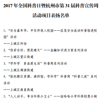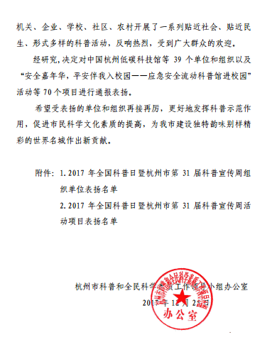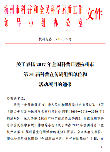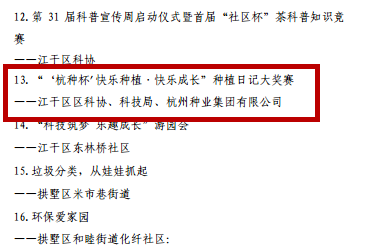 近日,集团公司收到杭州市科普和全民科学素质工作领导小组来文《关于表扬 2017 年全国科普日暨杭州市第 31 届科普宣传周组织单位和活动项目的通报》(杭科组办〔2017〕5 号),经严格审核研究,对种业集团携江干区科协、科技局联合举办的“‘杭种杯'快乐种植·快乐成长”种植日记大奖赛”活动(以下简称种植活动)进行通报表扬。