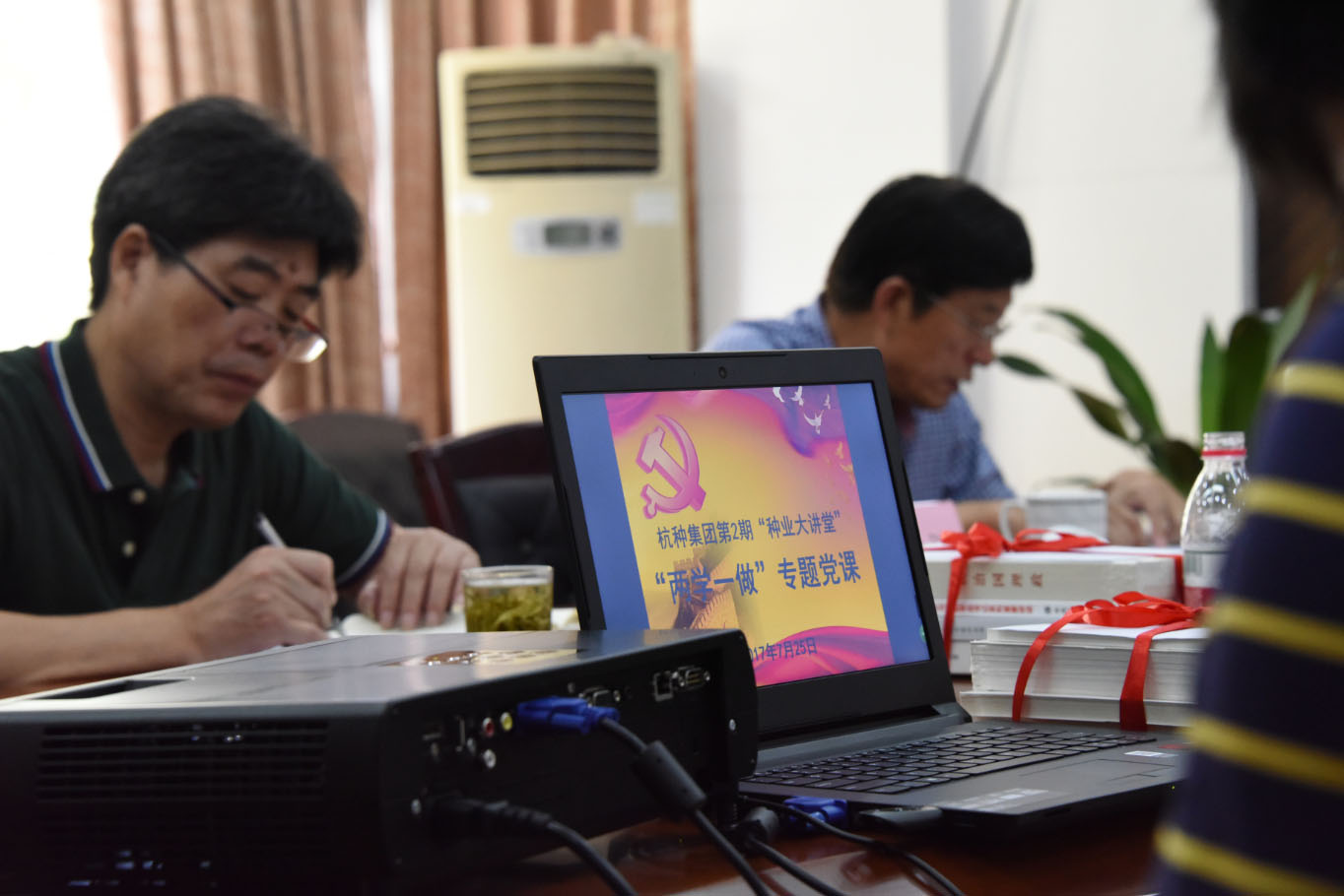 课前,米智处长和孙利祥董事长还向党员和入党积极分子发放“两学一做”学习读本。