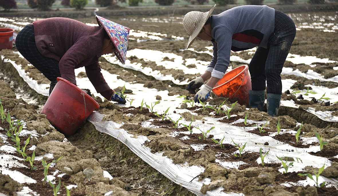 工人们正在移栽,基地工作人员拉着对标线一株一株地移栽,既满足了合理的种植间距,又使得整个种植区域整齐划一,排列整齐的种苗像是列队的士兵,等待着检阅,非常具有观赏性。