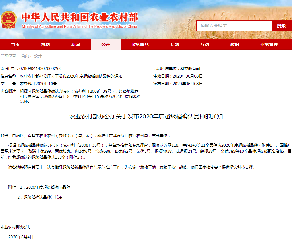 6月8日,农业农村部办公厅发布2020年超级稻品种认定结果, 304永利独占全国生产经营的‘中组143’成为早稻超级稻品种新成员。