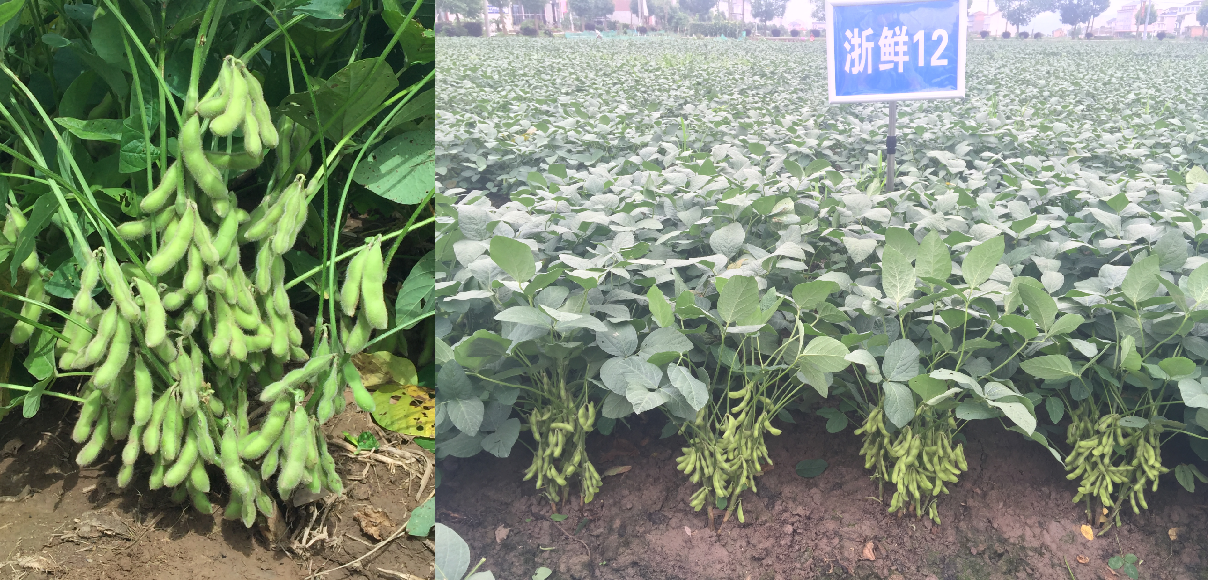 浙鲜12(浙审豆2017002):早熟鲜食春大豆新品种,白花、灰毛,青荚淡绿,长势较好,丰产性好,品质优,三粒荚多,豆荚饱满,百粒鲜重高,豆粒包衣好,淀粉含量高。2020年龙泉市小梅镇梅二村百亩示范方平均亩产达1600斤。