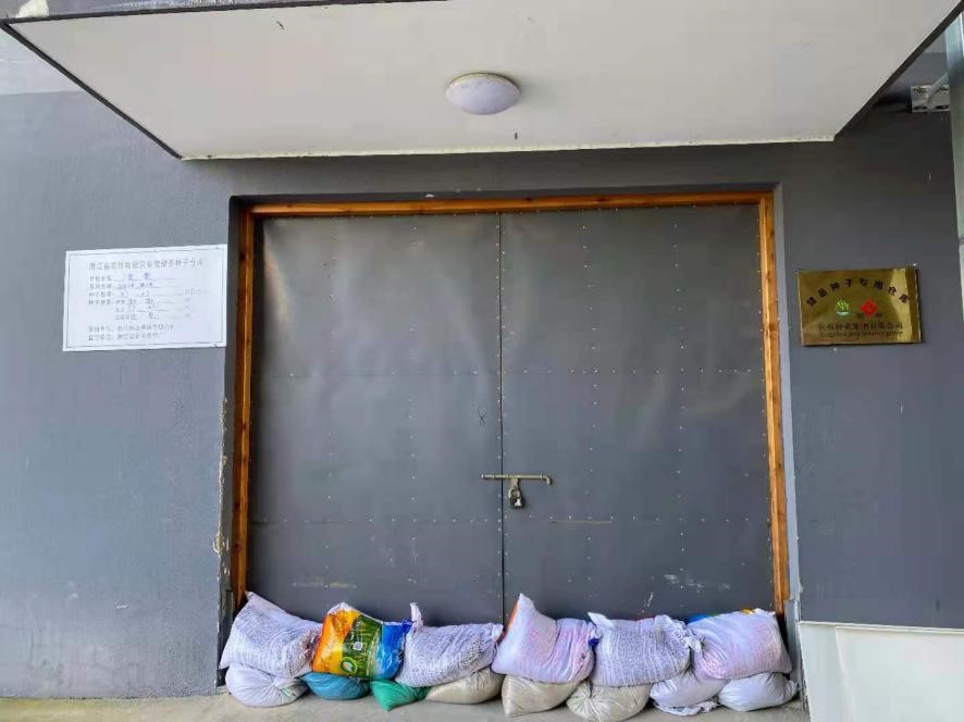 (种子仓库拦水沙袋防止雨水倒灌)
