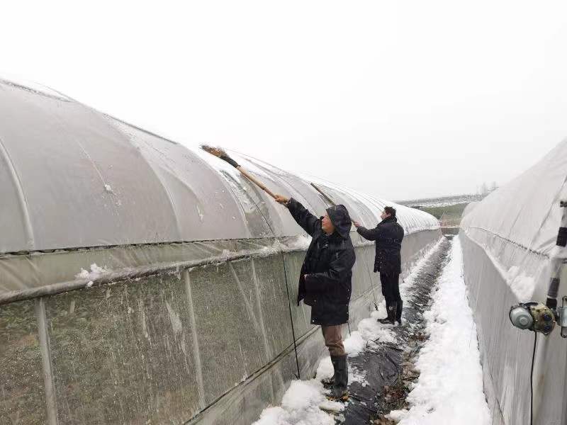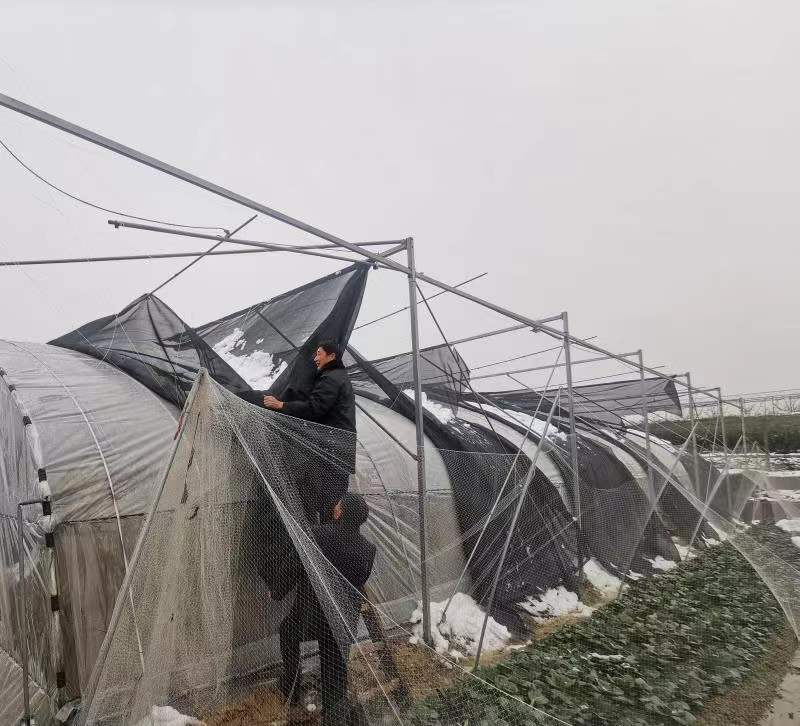 “割吧~ 棚里的东西重要!”面对被积雪弯的遮阳网,基地领导果断下了命令。连续的雨雪对本就不能超强负重的外遮阳来说,无非是雪上加霜,托膜线断裂,滑轨弯曲,如果雨雪再加剧,立架被压塌的概率非常大。遮阳网立架结构一旦压塌,位于遮阳网底下的蔬果种质资源棚也定会无一幸免。面对严峻的现场情况非常,先锋队员们扛起梯子就往前冲,对遮阳网进行破口排雪,扫的扫,撰的撰,尽管被寒风吹糊了双眼,被镰刀划破了手指,再寒冷的雨雪也浇灭不了先锋队员们坚守疫情保障防控的决心。面对疫情,先锋队员们第一时间落实防疫举措,豪不松懈筑牢防疫战线;面对保障防疫种子种源,先锋队员们也坚守初心使命,敢冲敢上守护责任担当。