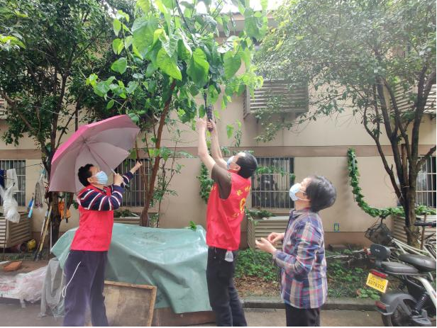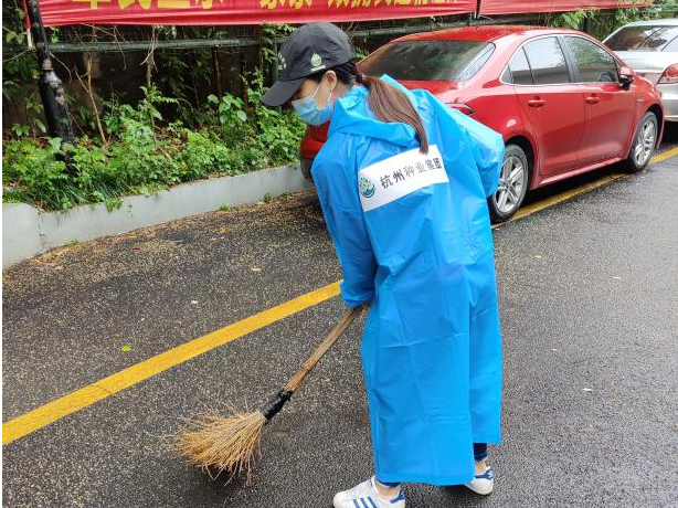 大风大雨天气刮断树枝、落叶满地,导致路面湿滑、阻碍较多,影响出行。志愿者们主动进行清扫,保障道路通畅。