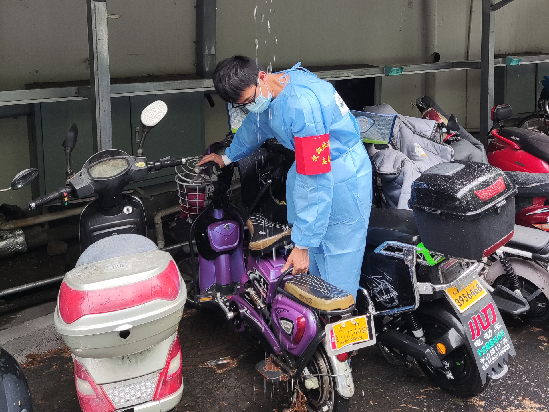 雨水淋湿电动车,容易浸入电瓶导致短路,带来安全风险隐患,志愿者们发现后第一时间给挪移位置。