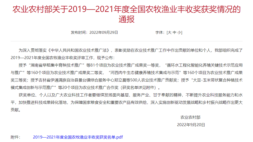 全国农牧渔业丰收奖是原农业部于1987年设立的农业技术推广奖,用于奖励在农业技术推广活动中做出突出贡献的集体和个人,每三年评选一次。其中农业技术推广成果奖奖励取得显著经济效益、社会效益和生态效益的农业技术推广项目,2019-2021年授予农业技术推广成果奖一等奖81项、二等奖和三等奖各160项。