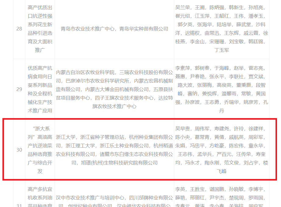 近日,农业农村部发布《关于2019-2021年度全国农牧渔业丰收奖获奖情况的通报》(农科教发【2022】5号),304永利与浙江大学等单位联合实施的《“浙大系列”高油高产抗逆油菜品种选育推广与综合开发》项目获得农业技术推广成果奖一等奖。据悉,集团已累计推广应用浙大619、浙大630、浙大622等“浙大系列”高油高产抗逆油菜品种804万亩,总经济效益达21.35亿元,综合效益十分显著。