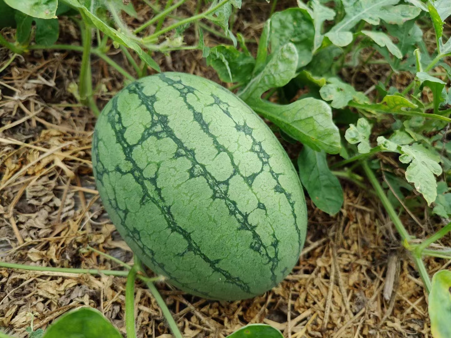 杂交种。鲜食。小型西瓜,二倍体。植株生长势中,果实发育期34天,全生育期96天。第一雌花节位7节,雌花出现的间隔节位3~5节。易坐果,果实椭圆形。有果皮蜡粉。单果重2.32千克,瓜瓤颜色黄。果皮厚度0.51厘米,果皮底色绿,果皮条纹条带隐。商品果实率95%。中心可溶性固形物含量11.77%,边可溶性固形物含量7.37%,果皮硬度脆,肉质细腻,口感爽脆。中感枯萎病。第1生长周期亩产3749千克,比对照金比特减产3.54%;第2生长周期亩产3516千克,比对照金比特减产1.17%。