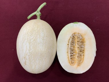 厚皮型杂交种。植株生长势强,株形中等。全生育期118天,果实发育期38天。雌花类型双性花,第一雌花节位10节;雌花出现的间隔节位1节;坐果习性子蔓孙蔓均可坐果,坐果易,果实类型网纹厚皮,形状椭圆,果皮底色白。果面部分网纹,网纹凸、细,稀果面裂纹。单果重量1.6千克;果肉颜色橙,果肉厚度3.9厘米;果实种腔中,果实香味淡,果实成熟后,果柄脱落难,商品果实率95%。中心可溶性固形物含量16.8%,边部可溶性固形物含量12.6%,肉质松脆、口感好,味鲜,甜而不腻。中抗白粉病、霜霉病。第1生长周期亩产2090.3千克,比对照西州蜜25号减产3.43%;第2生长周期亩产2199.7千克,比对照西州蜜25号减产1.02%。