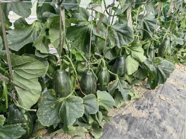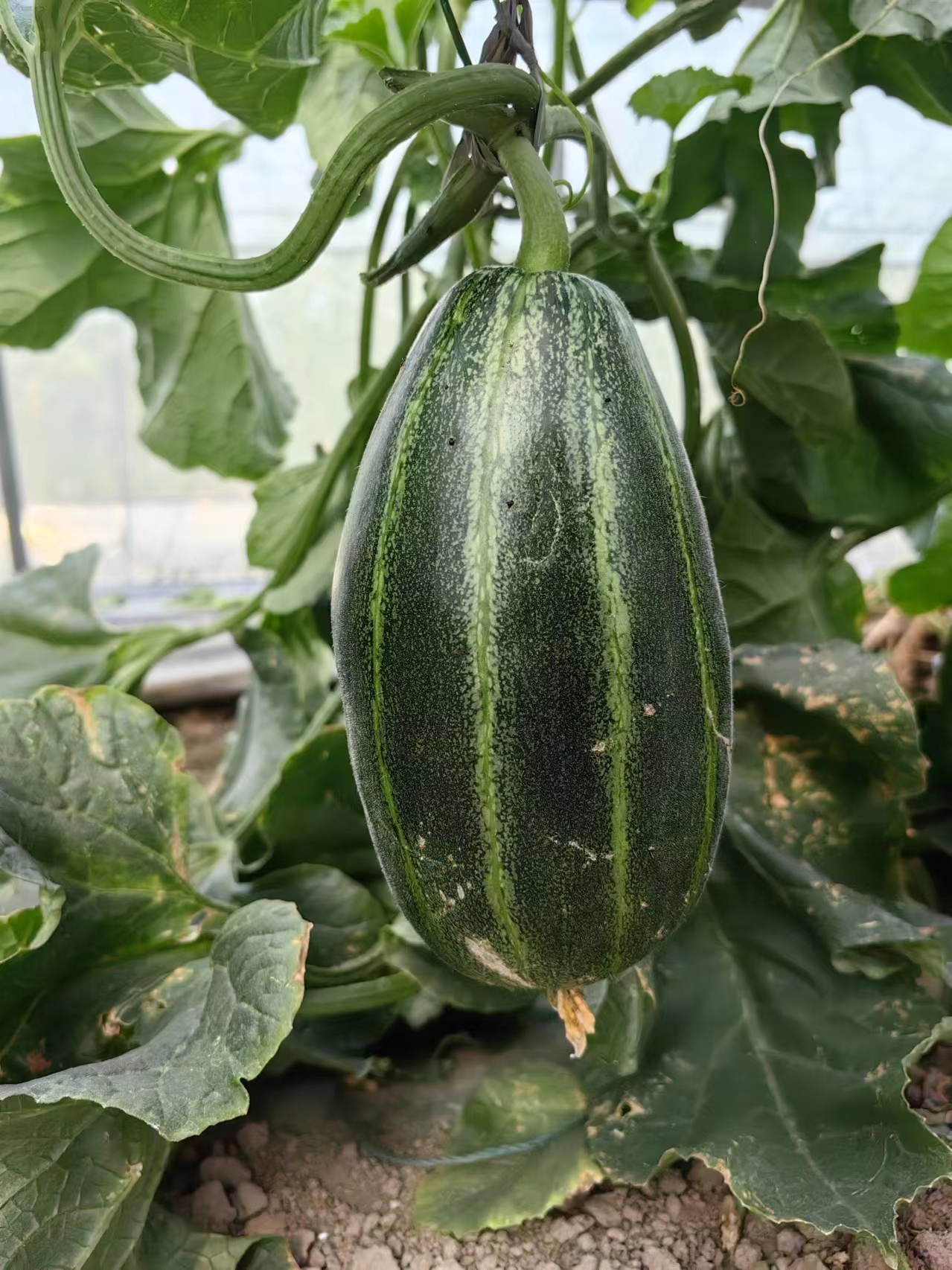 薄皮型常规种。植株生长势强,株形开张。全生育期97天,果实发育期34天。雌花类型双性花,第一雌花节位6节;雌花出现的间隔节位1节;坐果习性子蔓孙蔓均可坐果,坐果易,果实类型薄皮,形状梨形,果皮底色墨绿或黑。无果面裂纹。单果重量1.11千克;果肉颜色绿,果肉厚度2.49厘米;果实种腔中,果实香味淡,果实成熟后,果柄脱落难,商品果实率86%。中心可溶性固形物含量9.13%,边部可溶性固形物含量6.68%,脆甜爽口、风味清口。中抗白粉病、霜霉病。第1生长周期亩产2479.12千克,比对照慈脆1号减产7.68%;第2生长周期亩产2472.58千克,比对照慈脆1号减产8.33%。